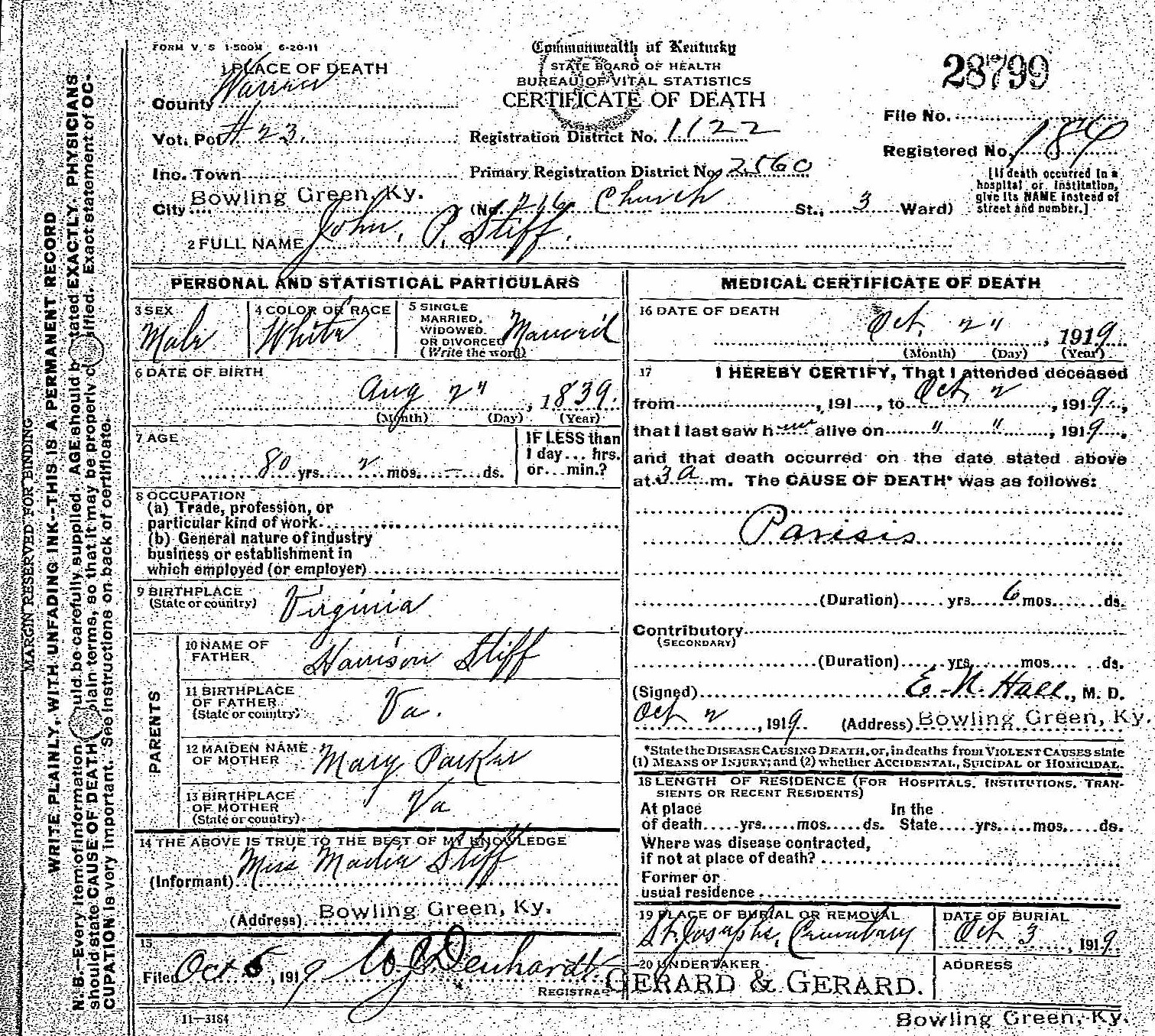October 2, 1919 St. Joseph Cemetery Bowling Green, KY |